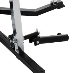 Un support pivotant pour les barres de musculation est apposé sur le côté. Des supports pour les disques de poids se trouvent sur la face arrière. La station présente une plus grande stabilité lorsque ces supports sont chargés.